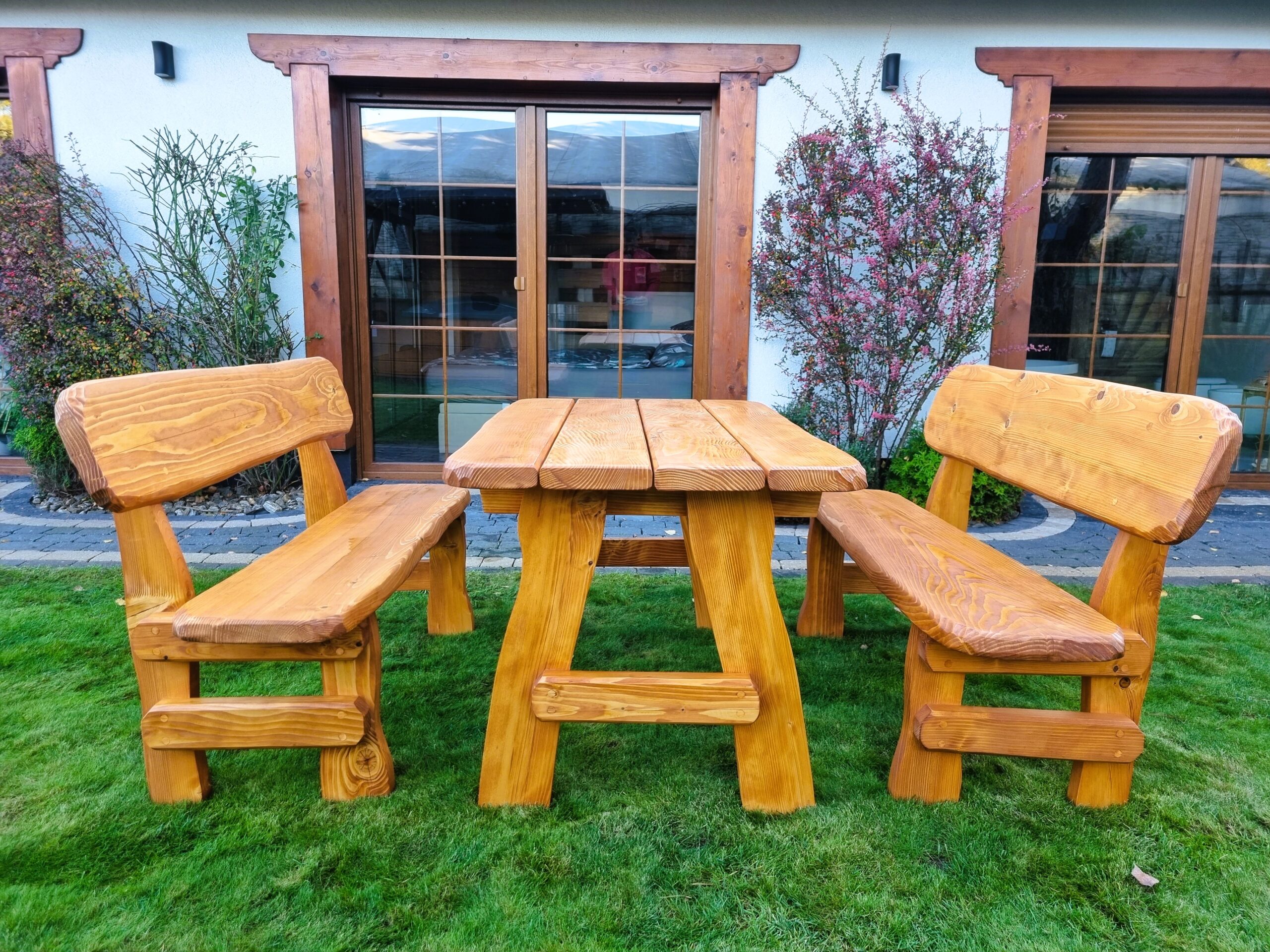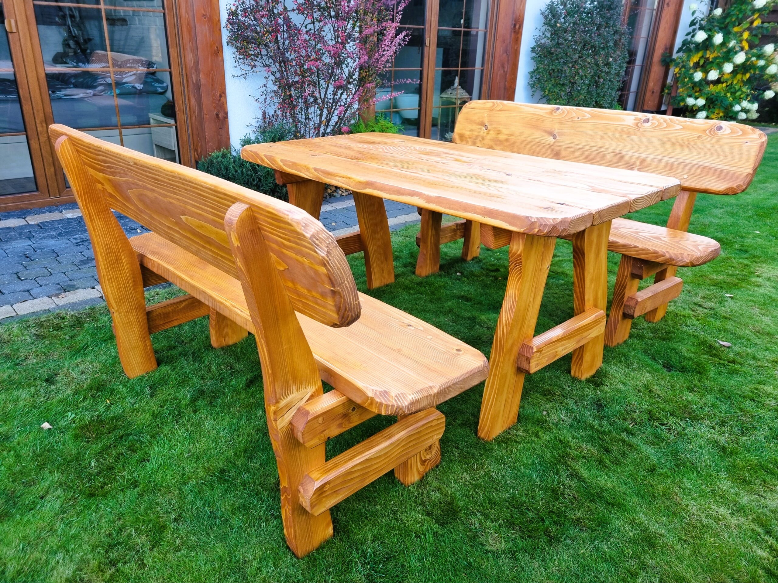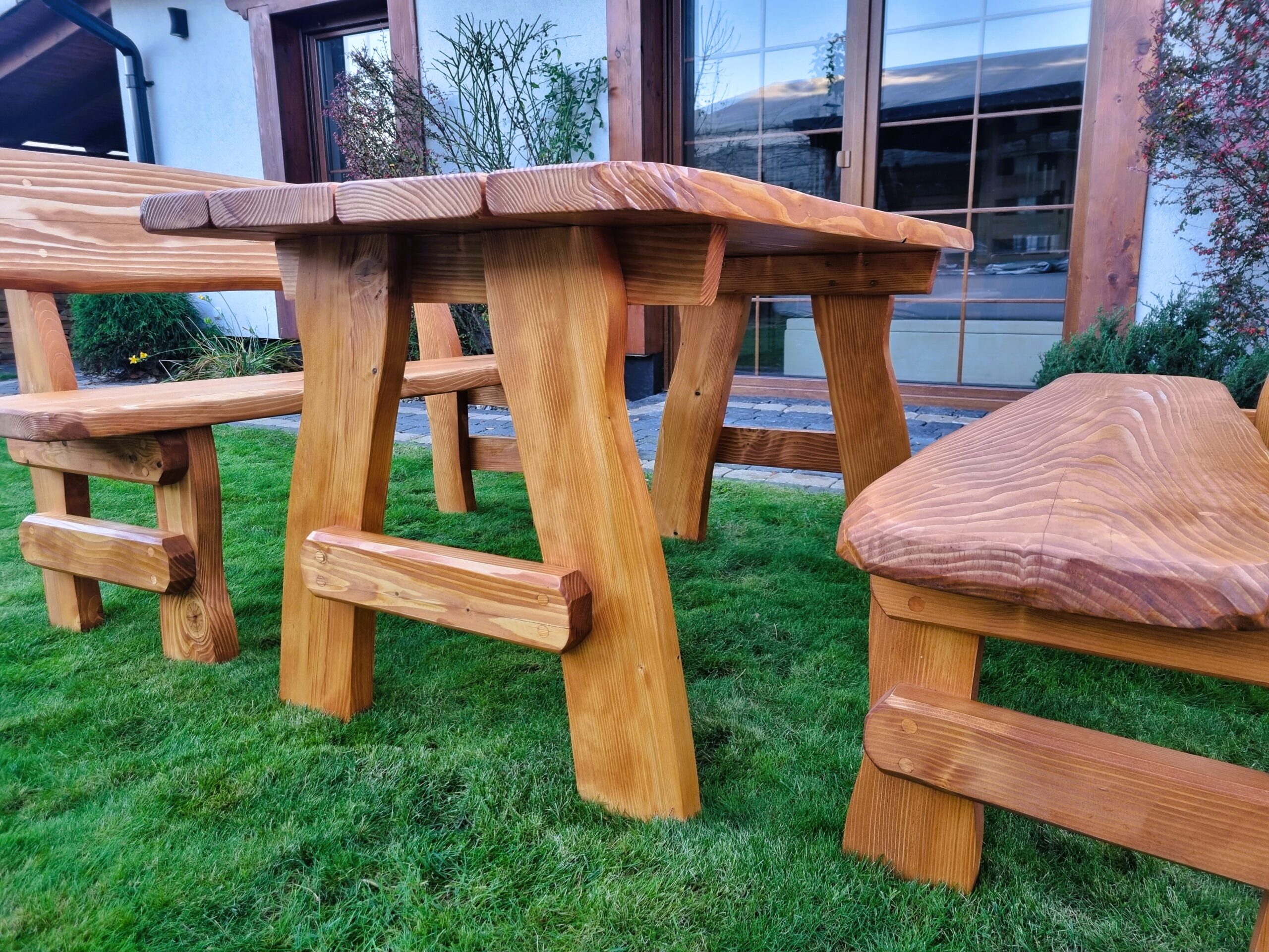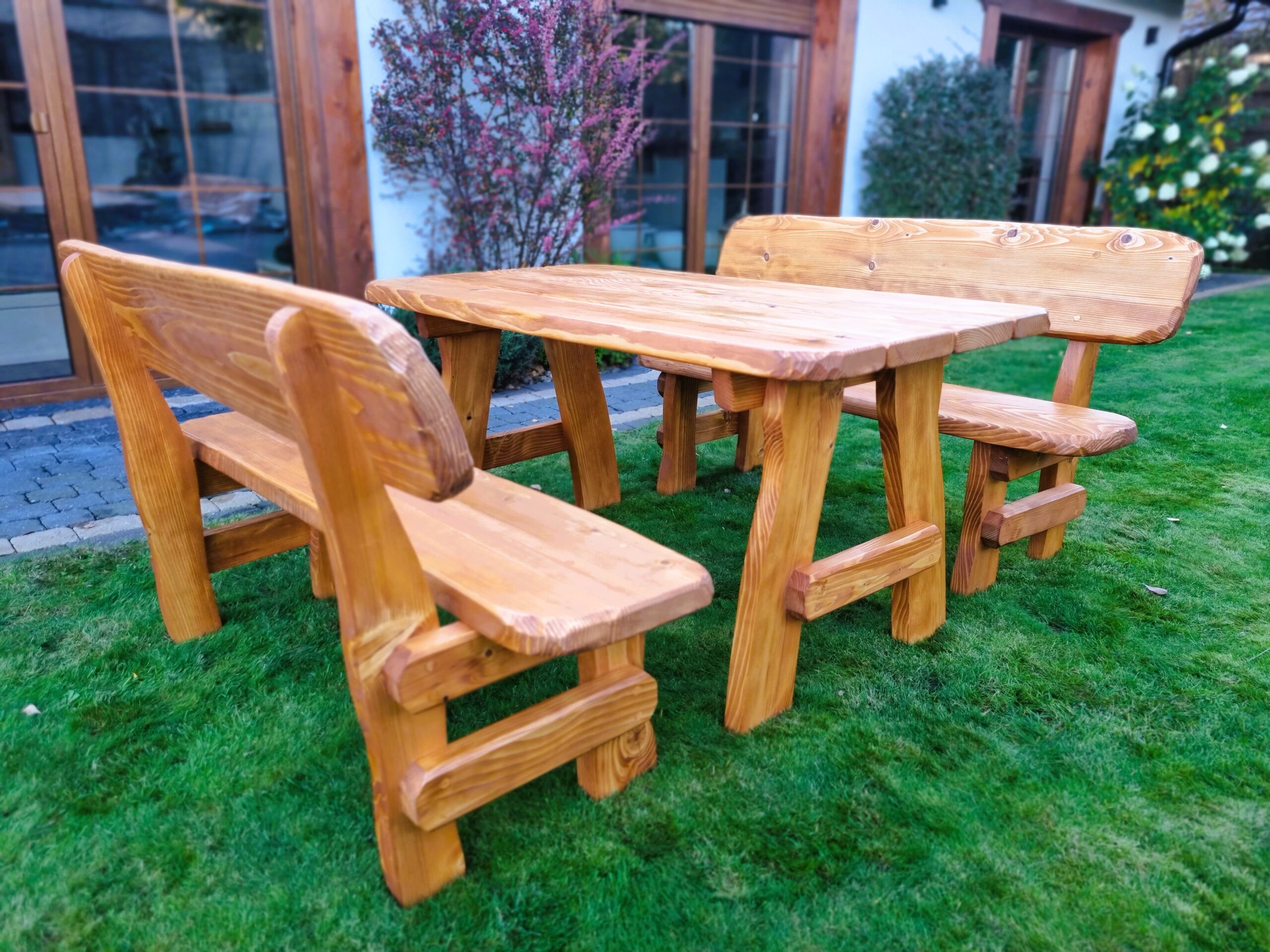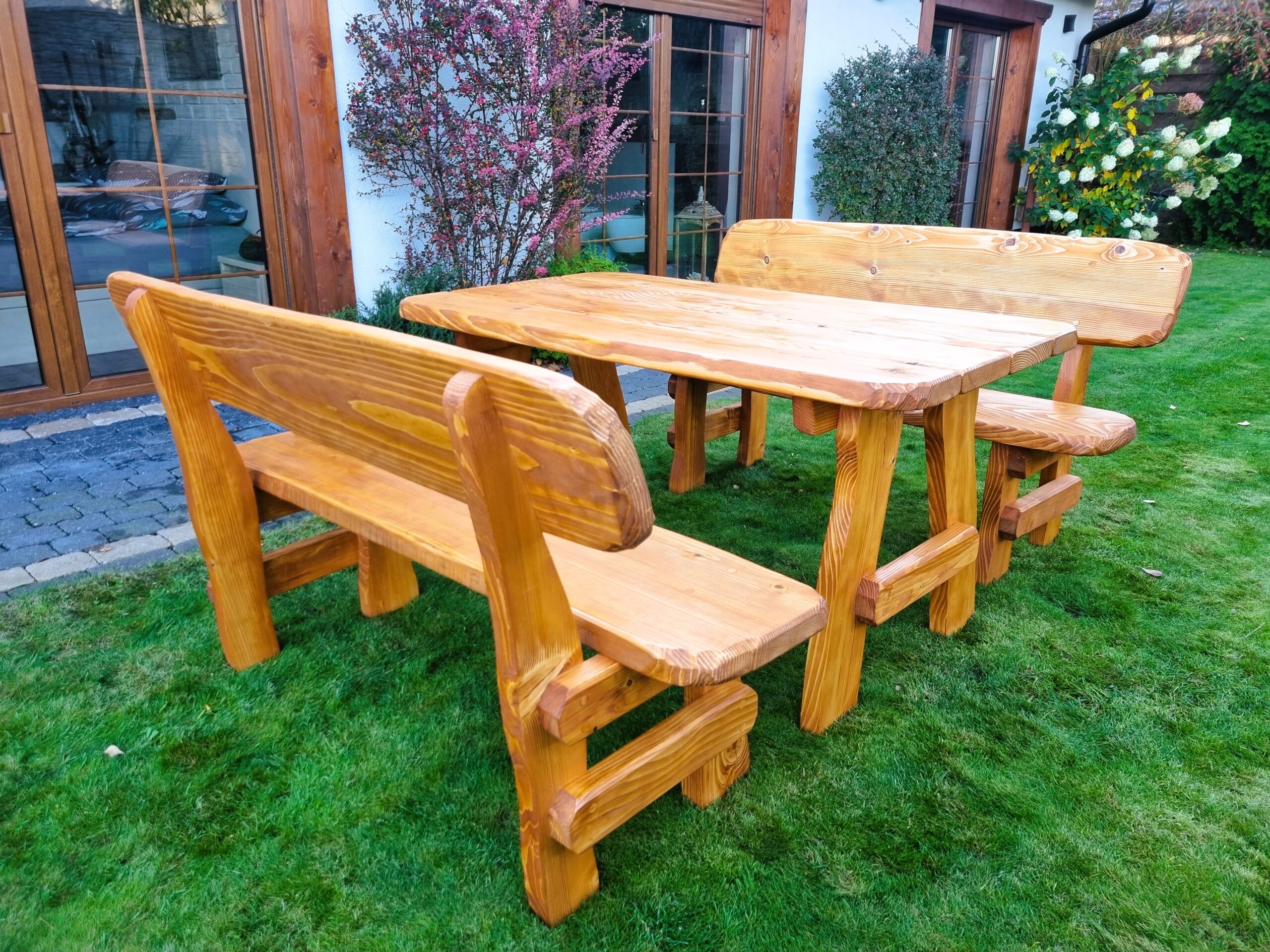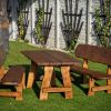 Gartensatz Piast für 6/8/10 Personen. Satz besteht aus zwei Bänken und einem Tisch.