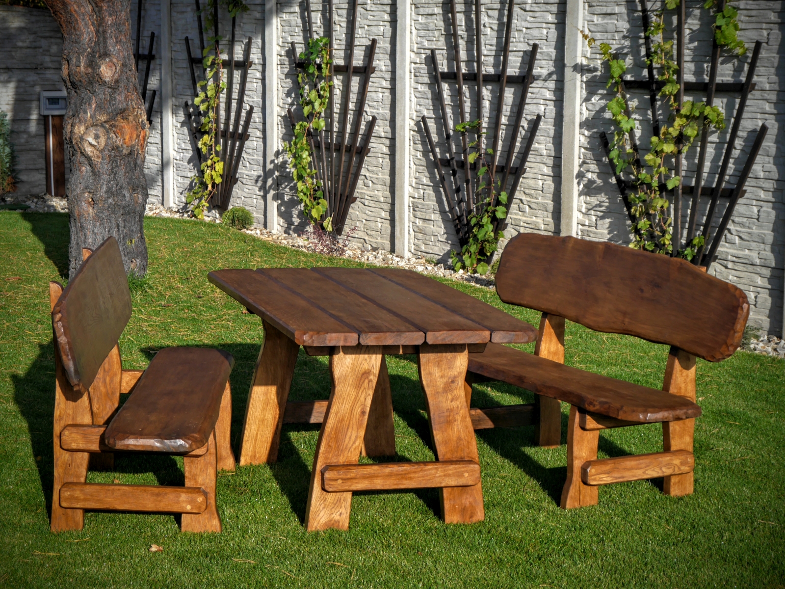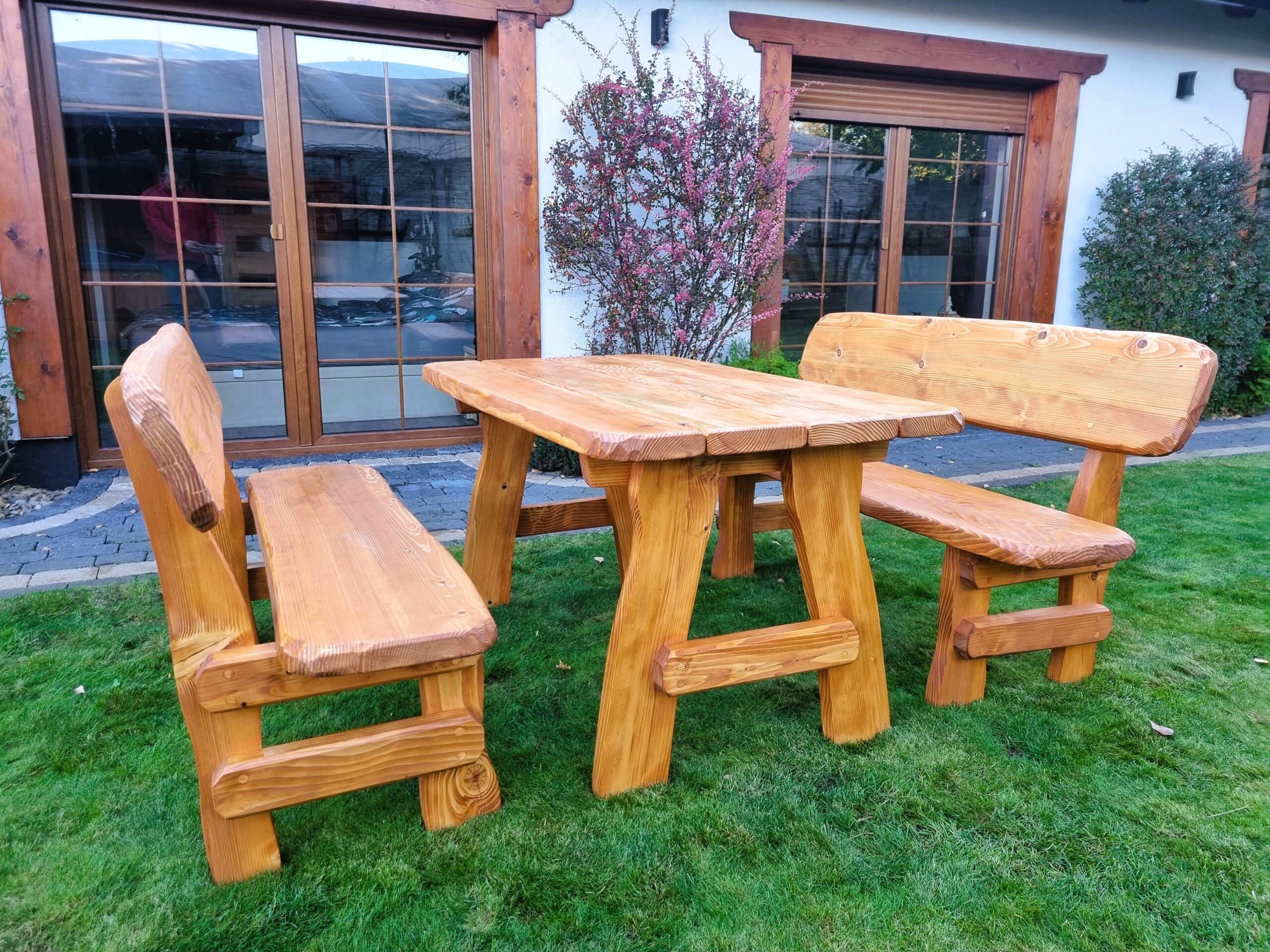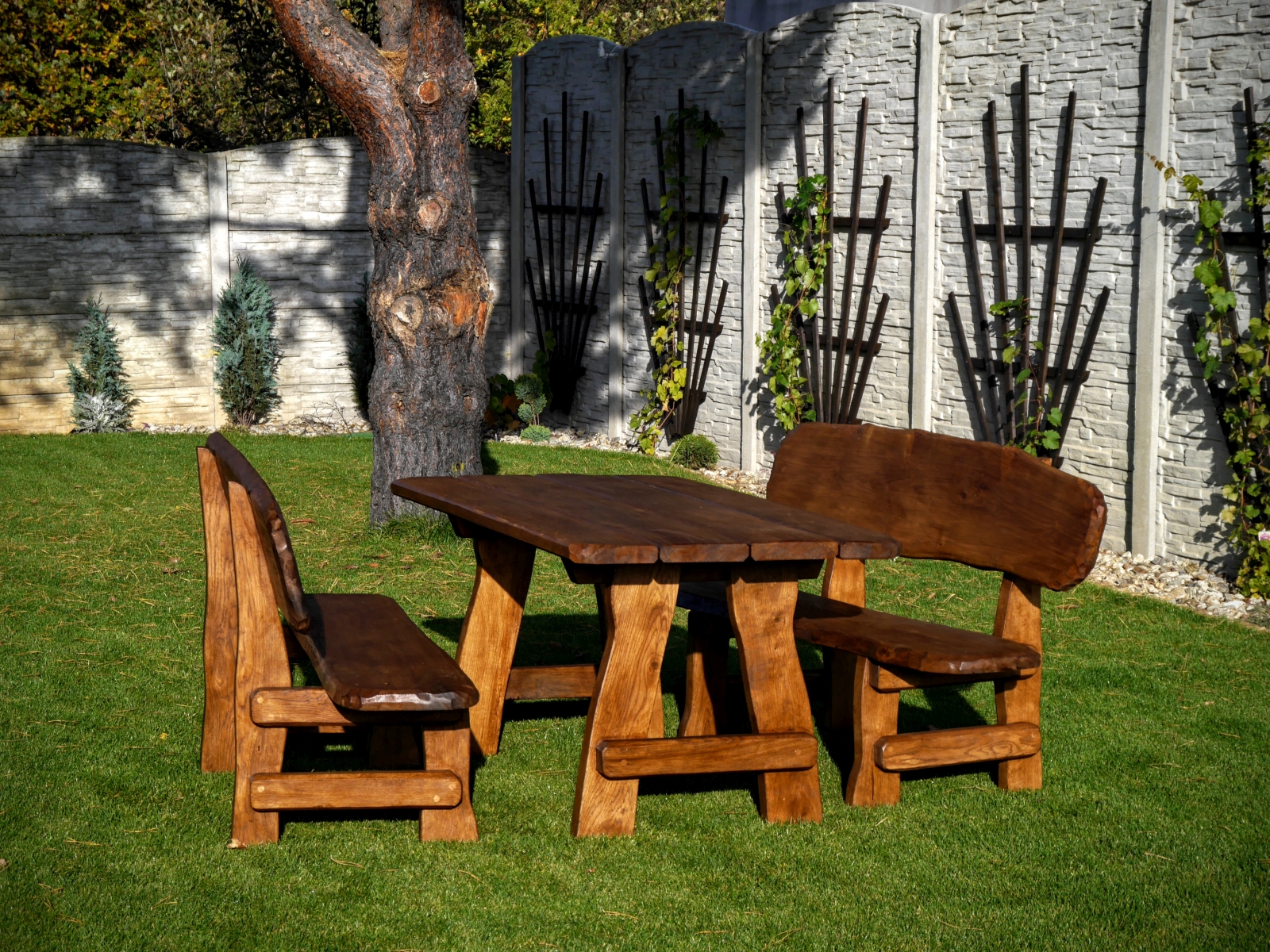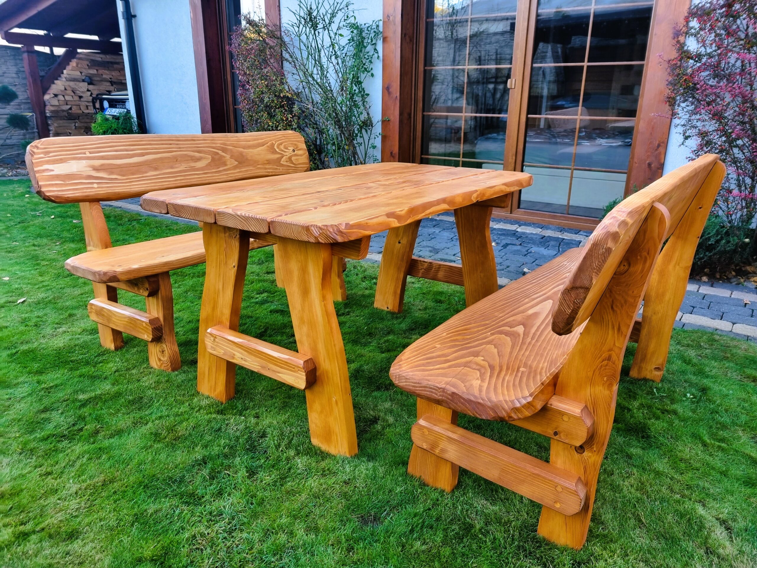 Gartensatz Piast für 6/8/10 Personen. Satz besteht aus zwei Bänken und einem Tisch.