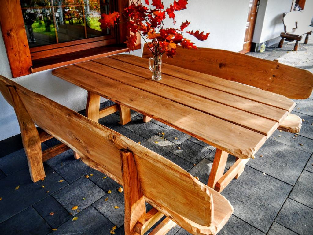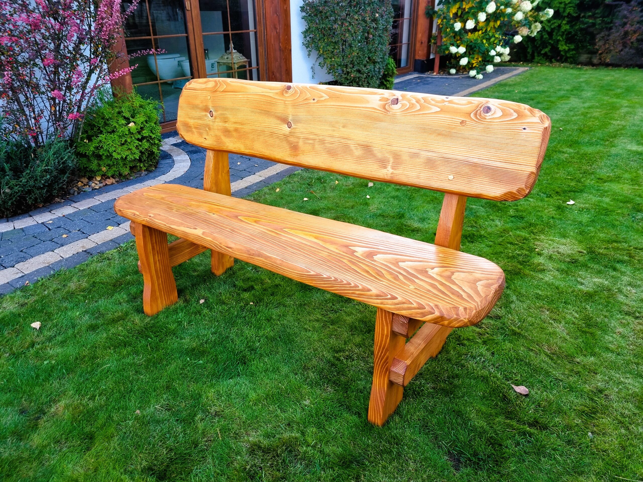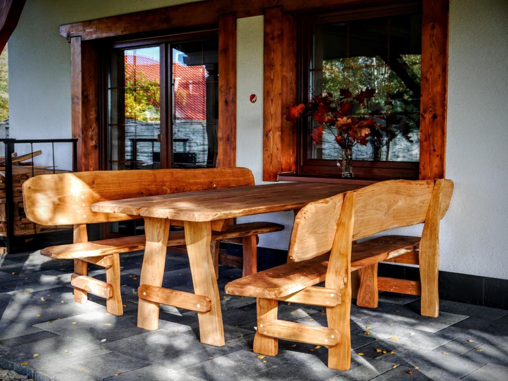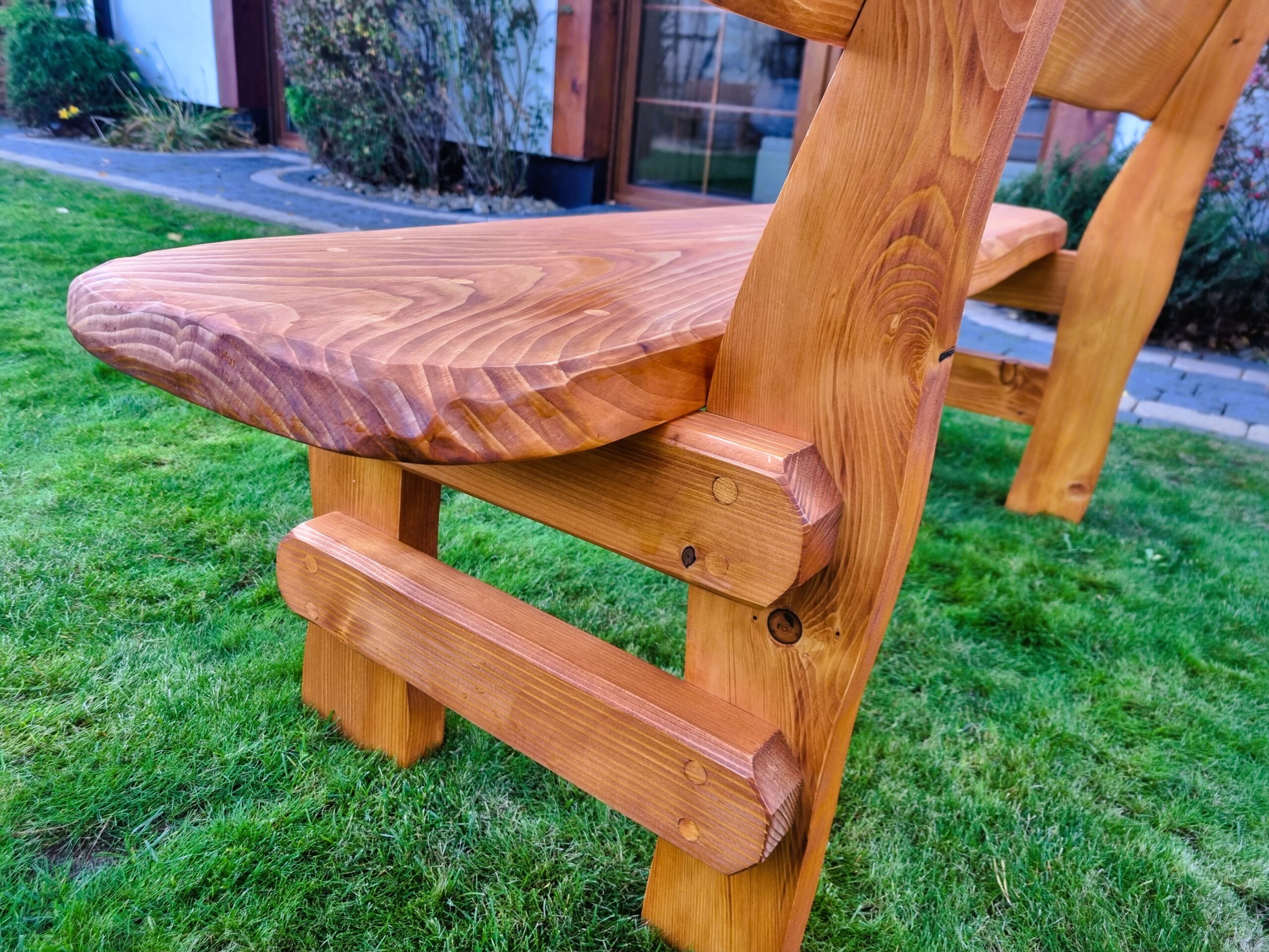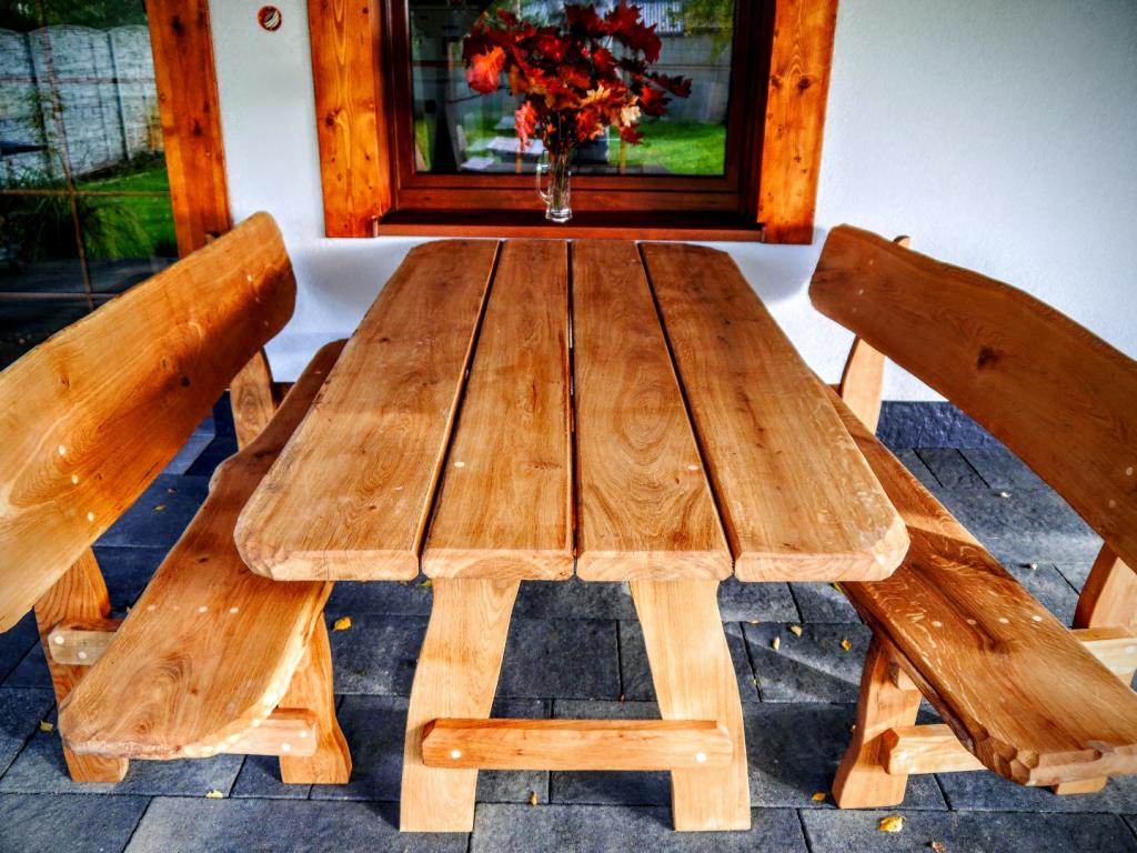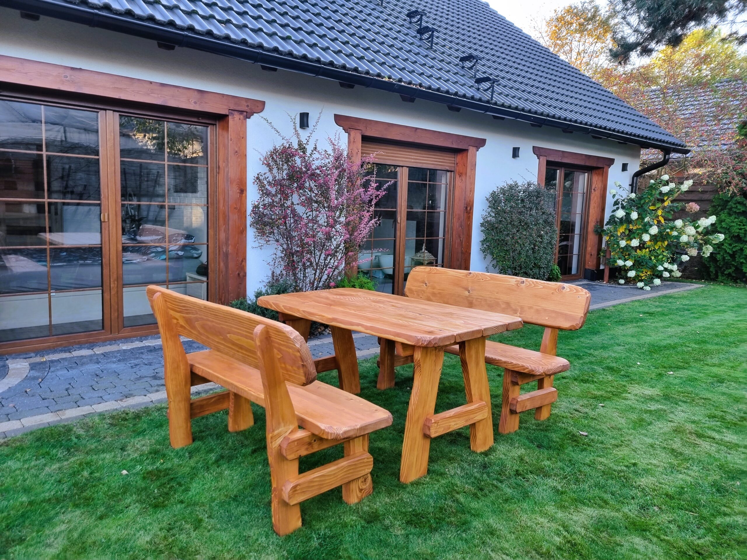 Gartensatz Piast für 6/8/10 Personen. Satz besteht aus zwei Bänken und einem Tisch.